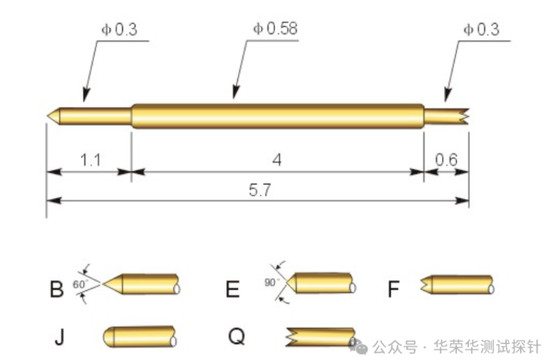 探針的總長度也是決定其應用范圍的一個因素,例如:一款產品型號為DP038-BU-5.7L的雙頭針的總長度為5.7mm。