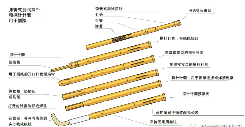 測試治具的工作行程和測試點需要不同的安裝高度,為了可以調整安裝的高度,探針針套制造了卡環和壓環系列,方便測試架上適用各種高度的測試,另外針套的連接測試板的一端的接口設計了不同的連接方式,有繞線、焊線等,能更好的為使用者服務。