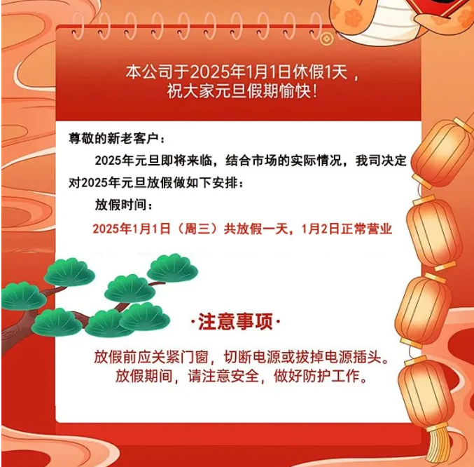 2025年元旦即將來臨,結合市場的實際情況,我司決定對2025年元旦放假做如下安排: