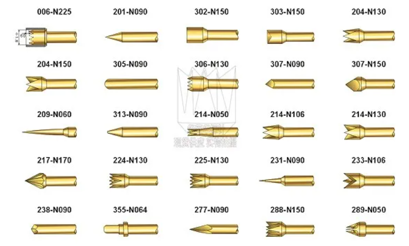 長度33.4mm,直徑1.37mm,行程6.35mm,行程直徑0.9mm,有杯頭,圓頭,平頭,尖頭,梅花頭等多種頭型可供選擇,并且有配套繞線針套R100-4W和焊線針套R100-4S,標(biāo)準(zhǔn)彈力為2N和3N,可接受定制