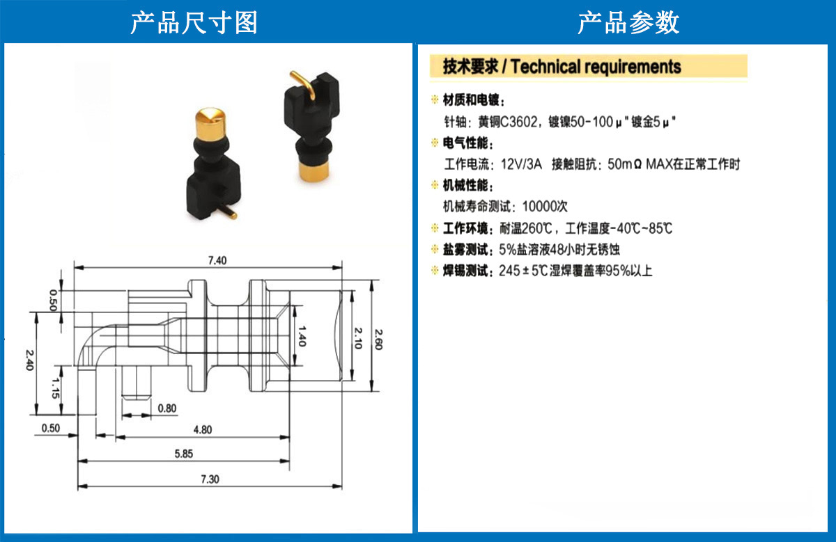 產(chǎn)品介紹:這個(gè)針通常用于智能手表,藍(lán)牙耳機(jī)上的有充電的功能,但是探針總體來(lái)說(shuō)還是測(cè)試的