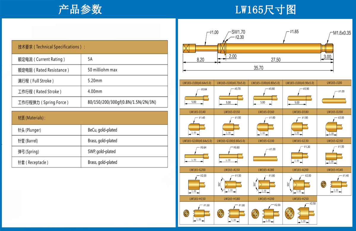 產(chǎn)品介紹:本產(chǎn)品一般用有定向作用的結束測試用,產(chǎn)品選用日本SK4 彈簧選用的是琴鋼線。工廠選用的材質(zhì)都是比較硬的,有利于在測試的時候過大電流不會容易損壞。